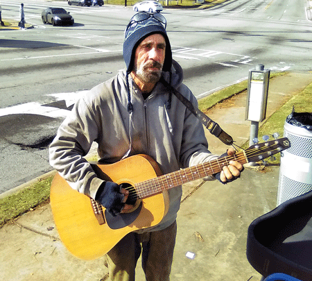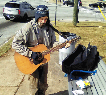 As I was leaving one of the Waffle Houses, I saw a guy sitting on a bench. So, I pulled my car over and started chatting with David. He was from Newport News, VA, and didn’t have any family in the area. As you can see, he had his guitar with him. So, I asked him what his favorite kind of music was. He let me know it was folk rock. “Anyone in particular you really like?” I asked. He let me know it was Bob Dylan. He pulled out his guitar and said, “Since you blessed me, I am going to bless you with a song!” Bob Dylan? What song do you think he picked?